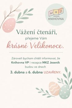 Vážení čtenáři, přejeme Vám krásné Velikonoce. Zároveň bychom chtěli informovat, že Knihovna VP i recepce MKZ Jeseník budou ve dnech 3. dubna a 6. dubna UZAVŘENY.