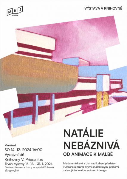 Zveme vás na výstavu mladé umělkyně z Ústí nad Labem. Natálie Nebáznivá představuje v Jeseníku průřez svými studentskými pracemi, zahrnující malbu, animaci i design. V dílech často reflektuje své rodné město a jeho vliv na formování osobnosti, vystavuje též díla ze své bakalářské práce zabývající se dětskou imaginací.