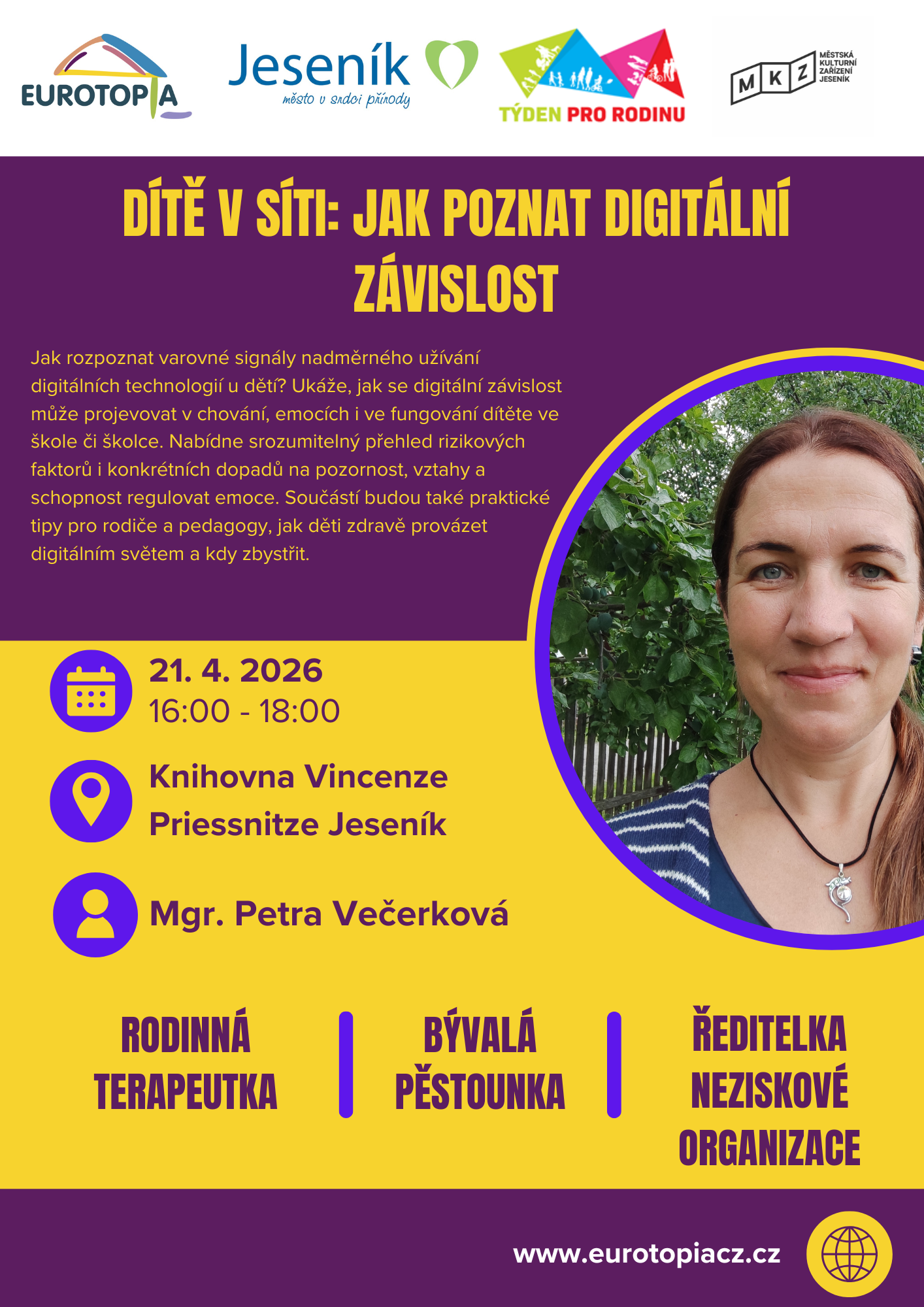 Součástí budou také praktické tipy pro rodiče a pedagogy, jak děti zdravě provázet digitálním světem a kdy zbystřit.
